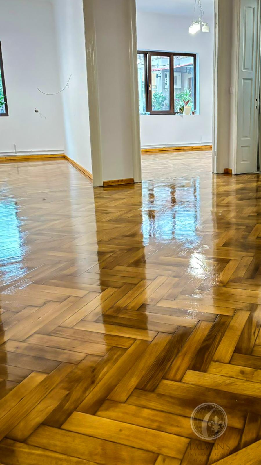 • The spacious, light-filled living spaces are enhanced by magnificent period herringbone parquet floors, whose impeccable restoration makes the wood sing under every step.